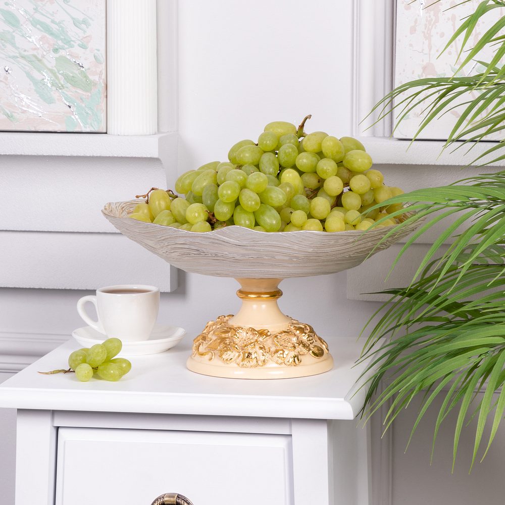Фруктовница-конфетница «Лето» — изысканный акцент для вашего интерьера и стильный способ подать угощение. Фигурная основа из прочного литьевого мрамора поддерживает стеклянную чашу, в которой красиво смотрятся свежие фрукты, конфеты, орехи или десерты.