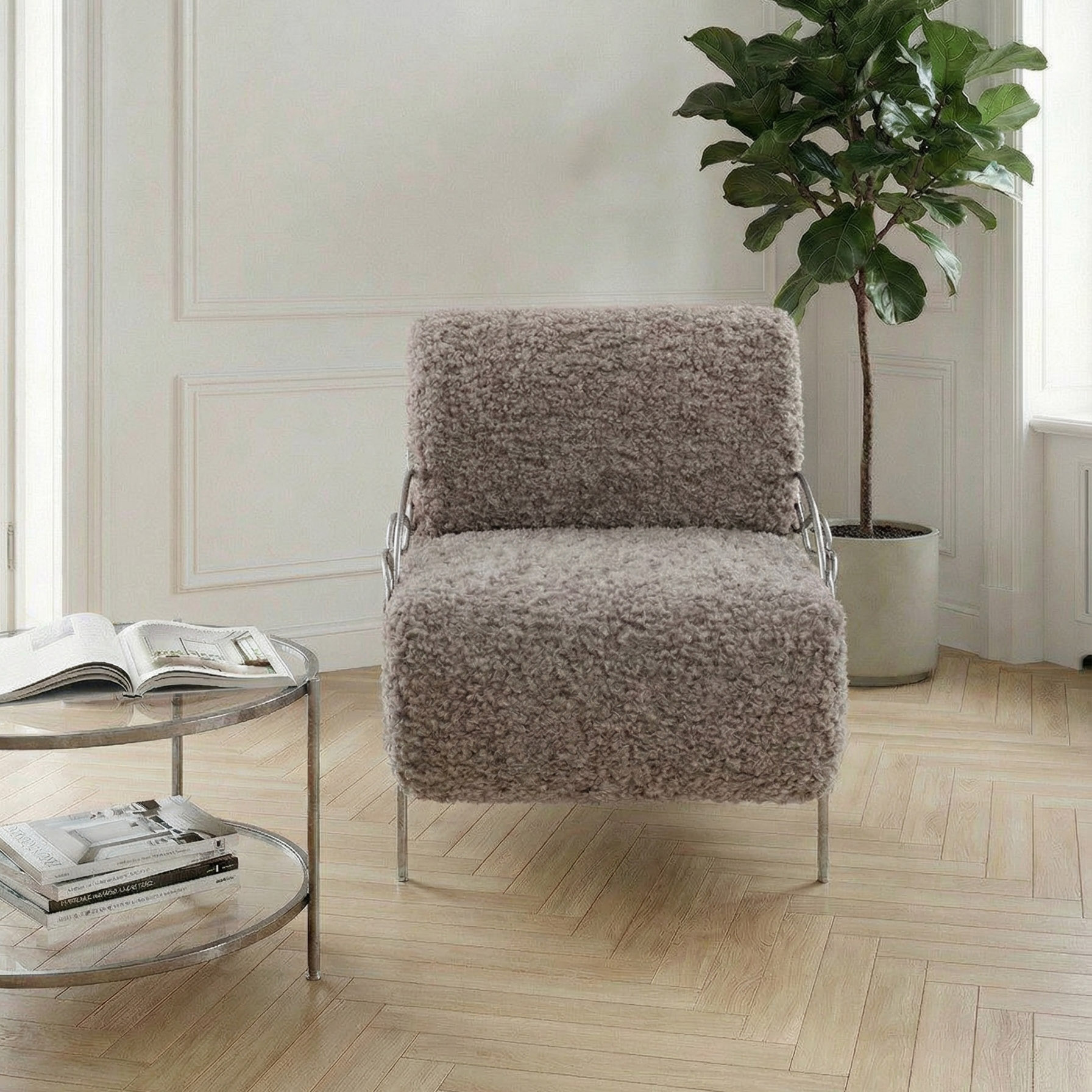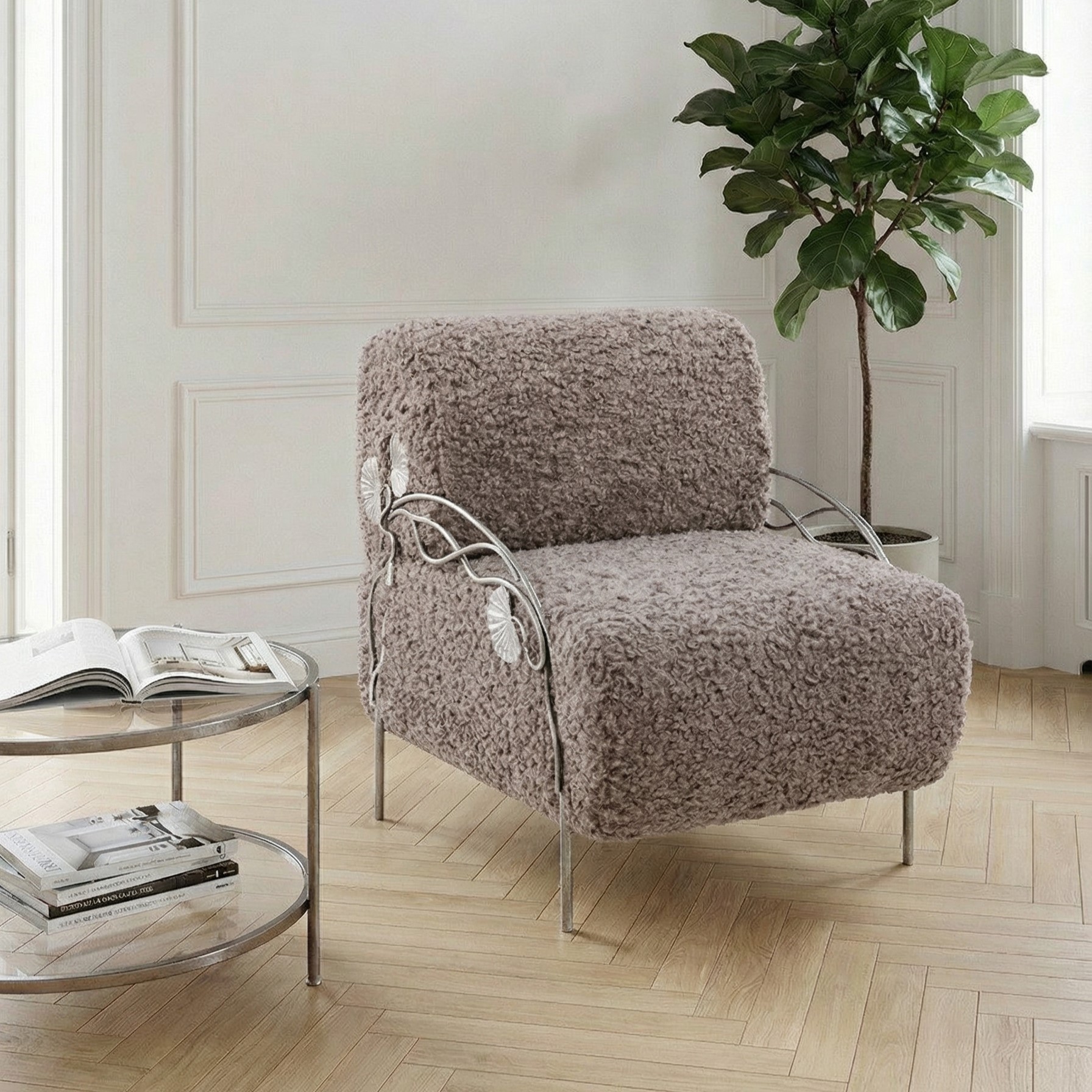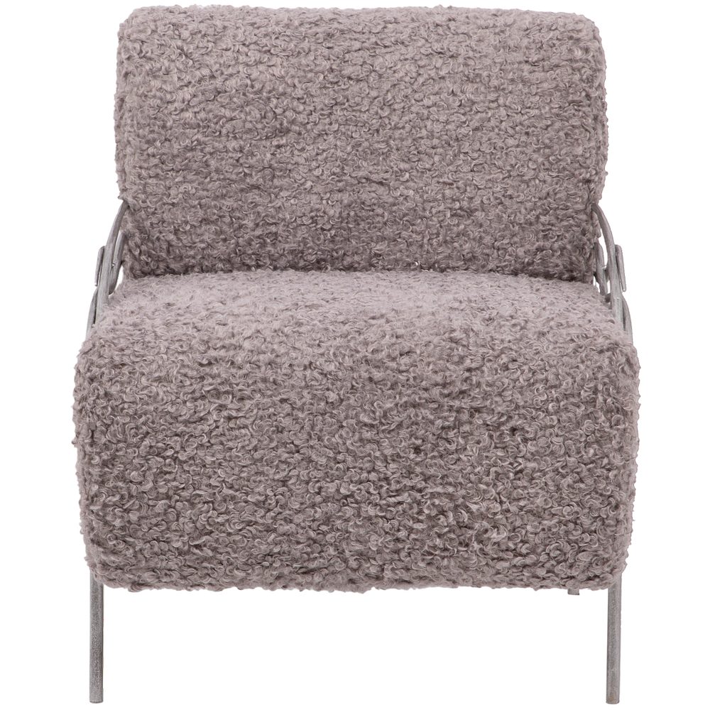 Модель выполнена из прочной кованой стали и отделана мягкой мебельной тканью с добавлением искусственного меха. Такое сочетание делает кресло не только декоративным акцентом, но и по-настоящему уютным местом для отдыха.