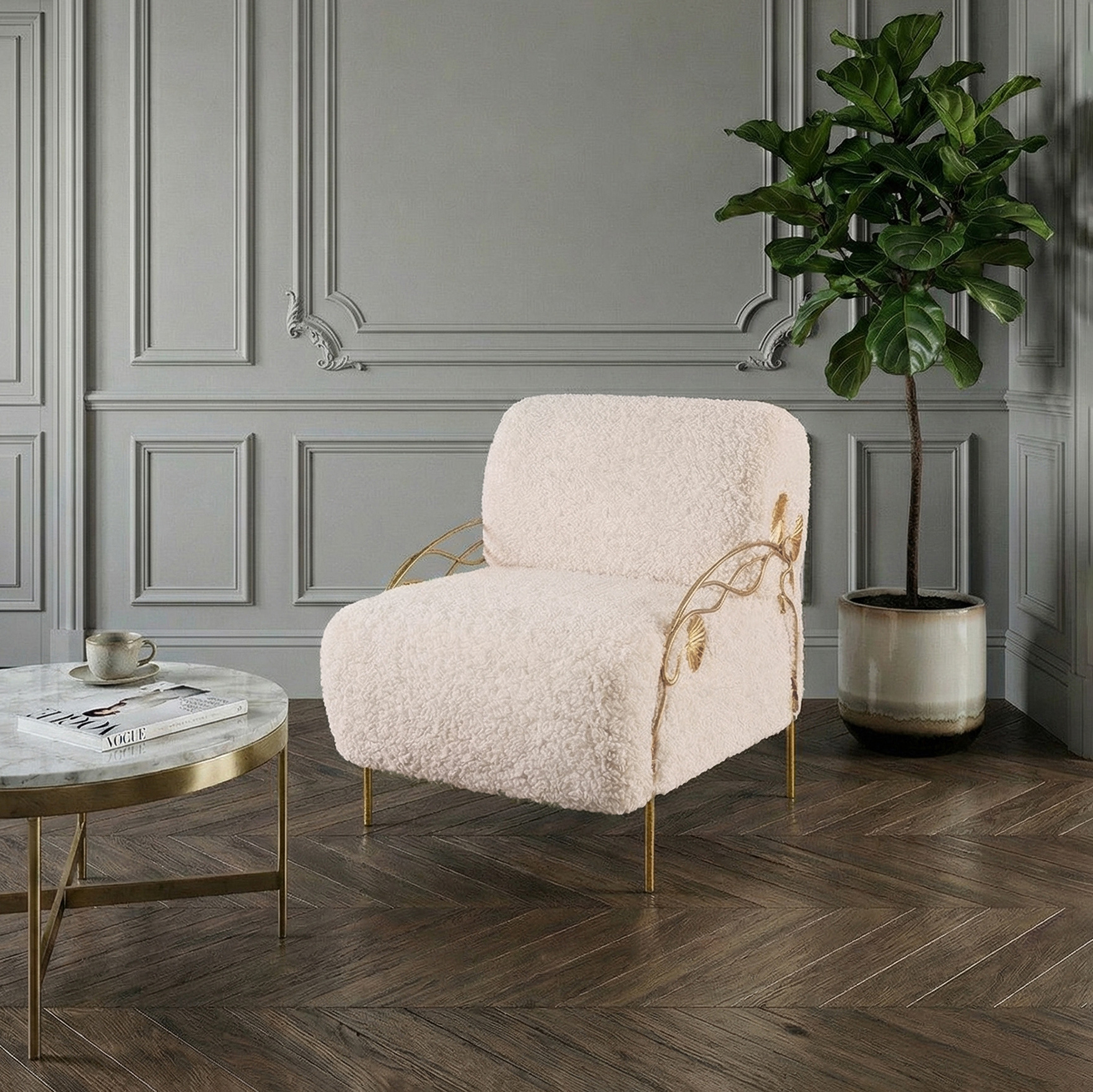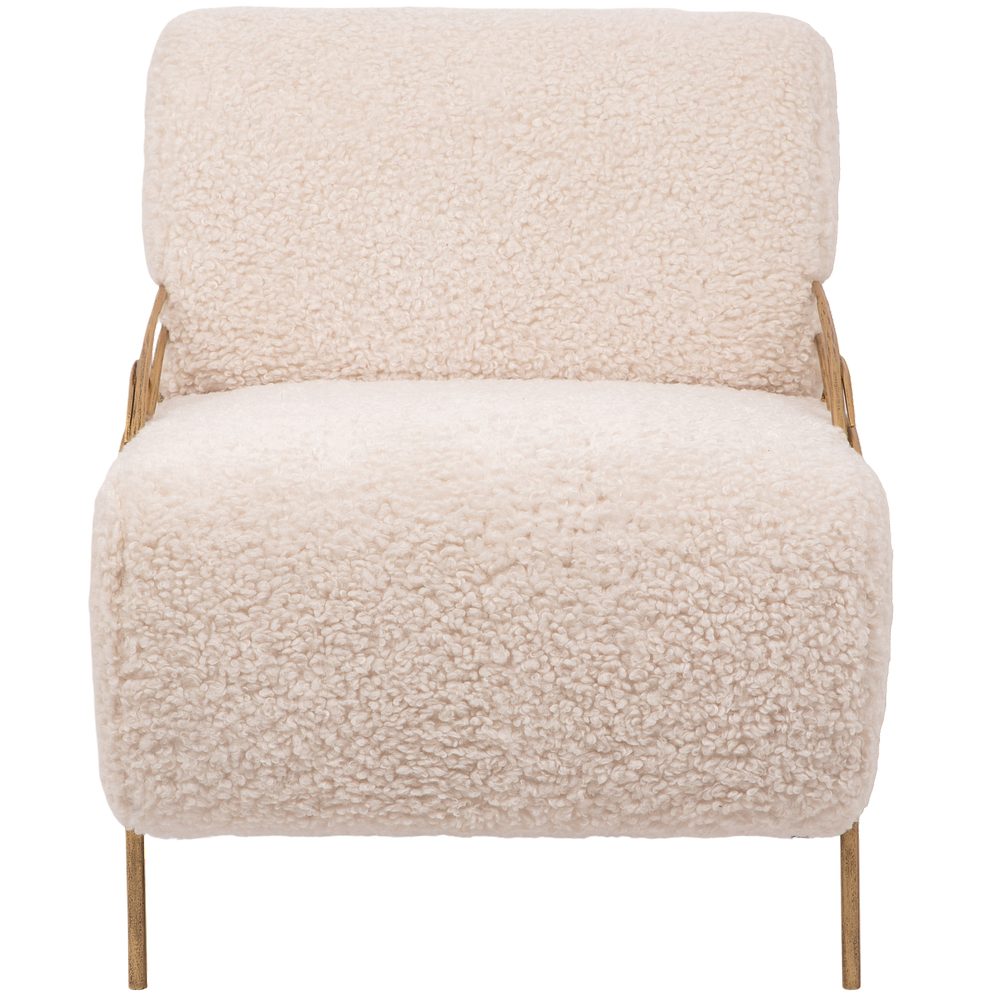 Модель выполнена из прочной кованой стали и отделана мягкой мебельной тканью с добавлением искусственного меха. Такое сочетание делает кресло не только декоративным акцентом, но и по-настоящему уютным местом для отдыха.