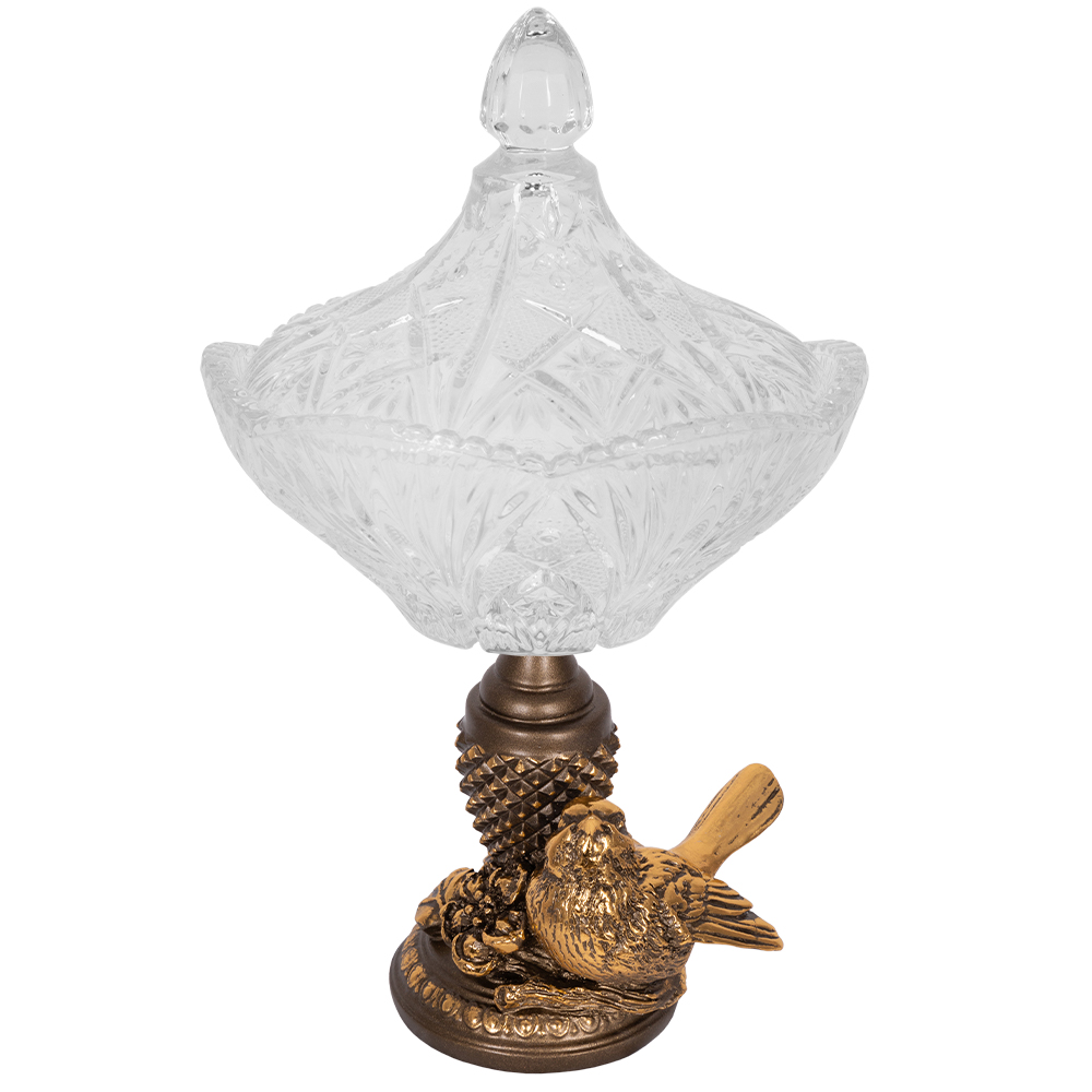Сахарница на ножке тщательно упакована для безопасной транспортировки. Изделие помещается в ложемент, оборачивается воздушно-пузырчатой пленкой и укладывается в прочную коробку из гофрированного картона. Это гарантирует, что декор для интерьера приедет к вам в целости и сохранности.