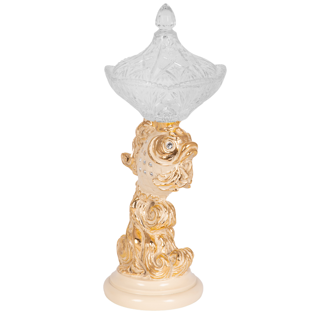 Сахарница на ножке тщательно упакована для безопасной транспортировки. Изделие помещается в ложемент, оборачивается воздушно-пузырчатой пленкой и укладывается в прочную коробку из гофрированного картона. Это гарантирует, что декор для интерьера приедет к вам в целости и сохранности.