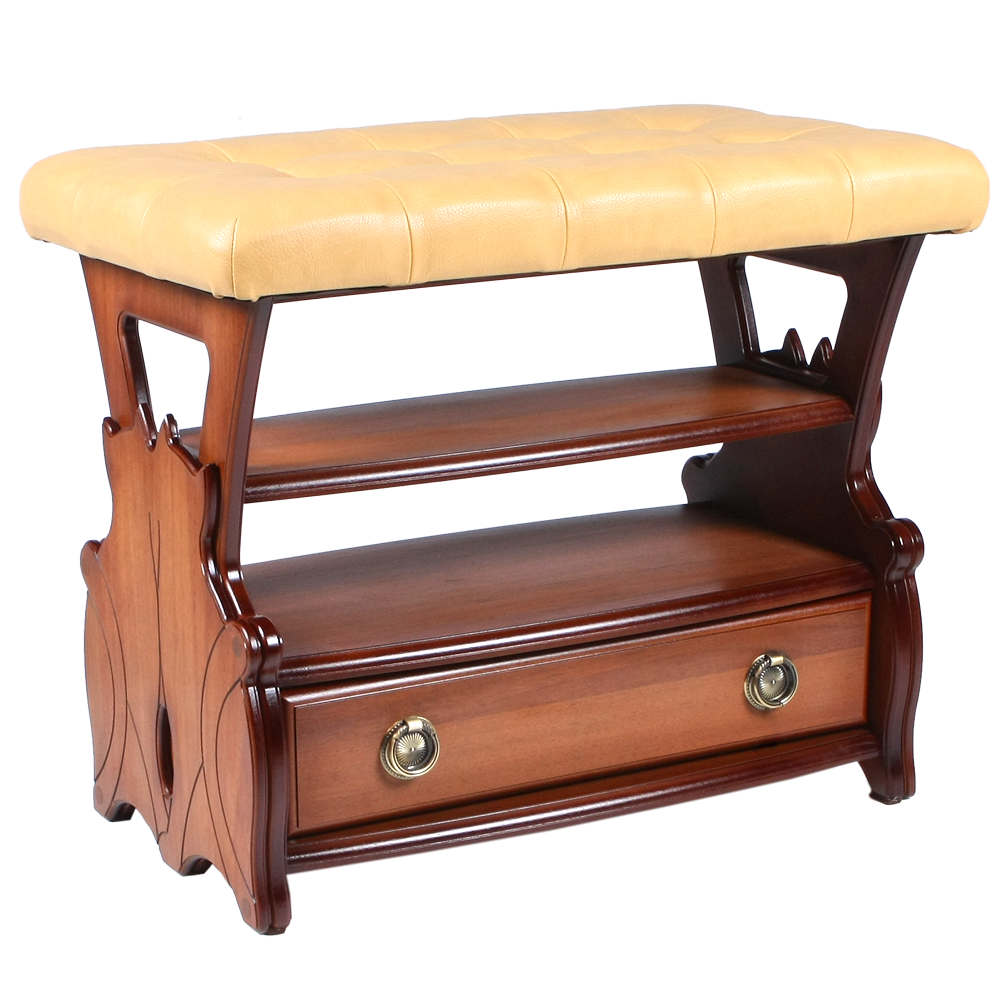 Скамья с нижним выдвижным ящиком и двумя полочками. Торцевые стороны декорированы фигурами кошек. Посадочное место выполнено в классической техники капитоне. Изделие отличается прочной устойчивой конструкцией и прослужит не один год! Гарантия на изделие - 24 месяца.