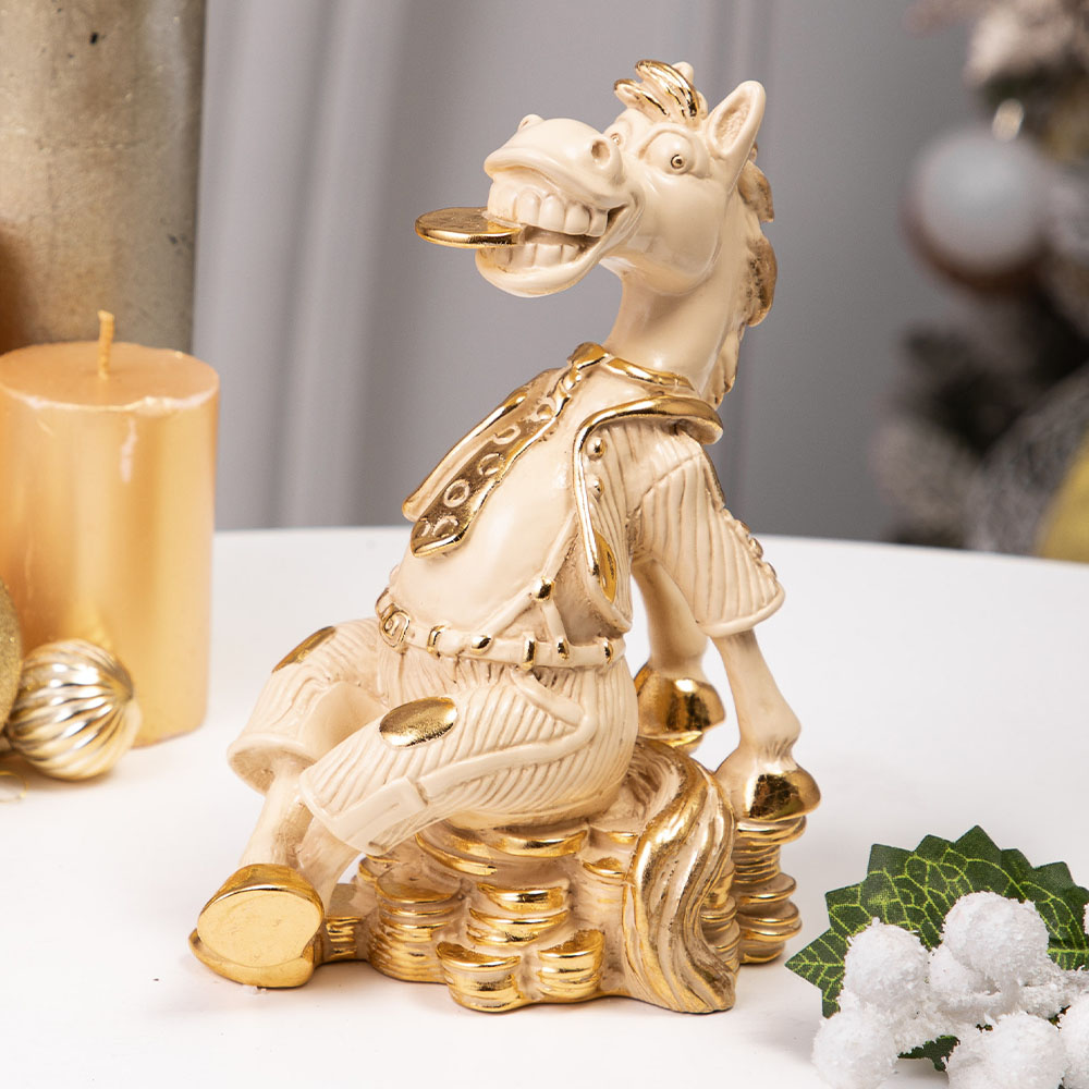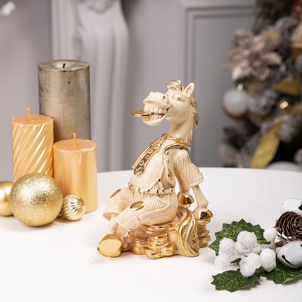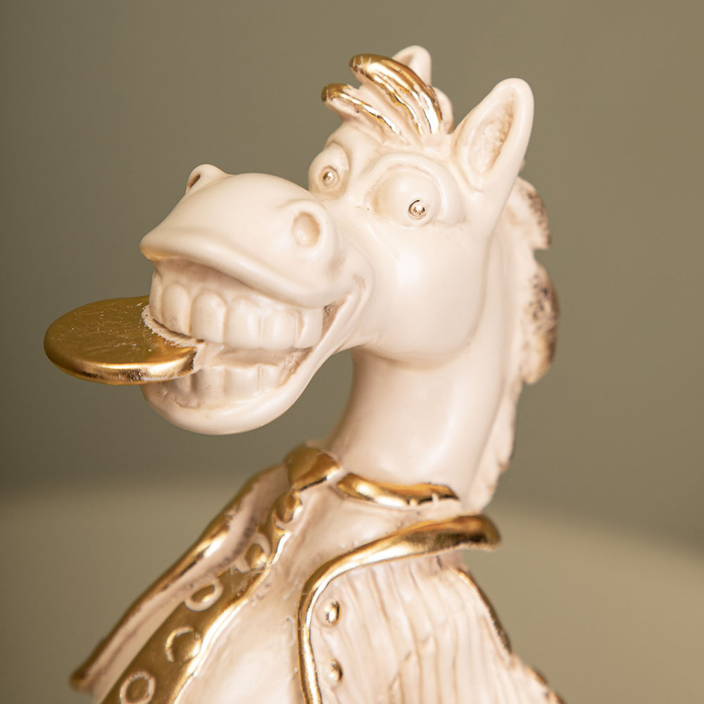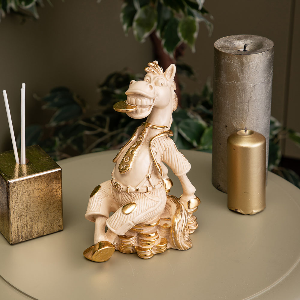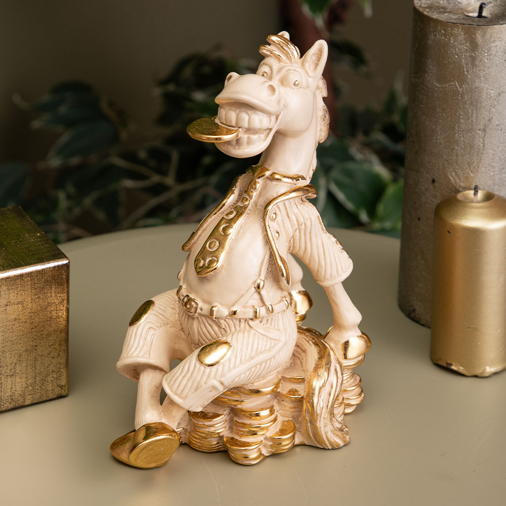 "Конь Джулиан" – это не только элегантный арт-объект, но и сильный талисман для привлечения финансового успеха. Его задорная улыбка и игривая поза создают позитивную атмосферу, а монеты усиливают символику богатства.