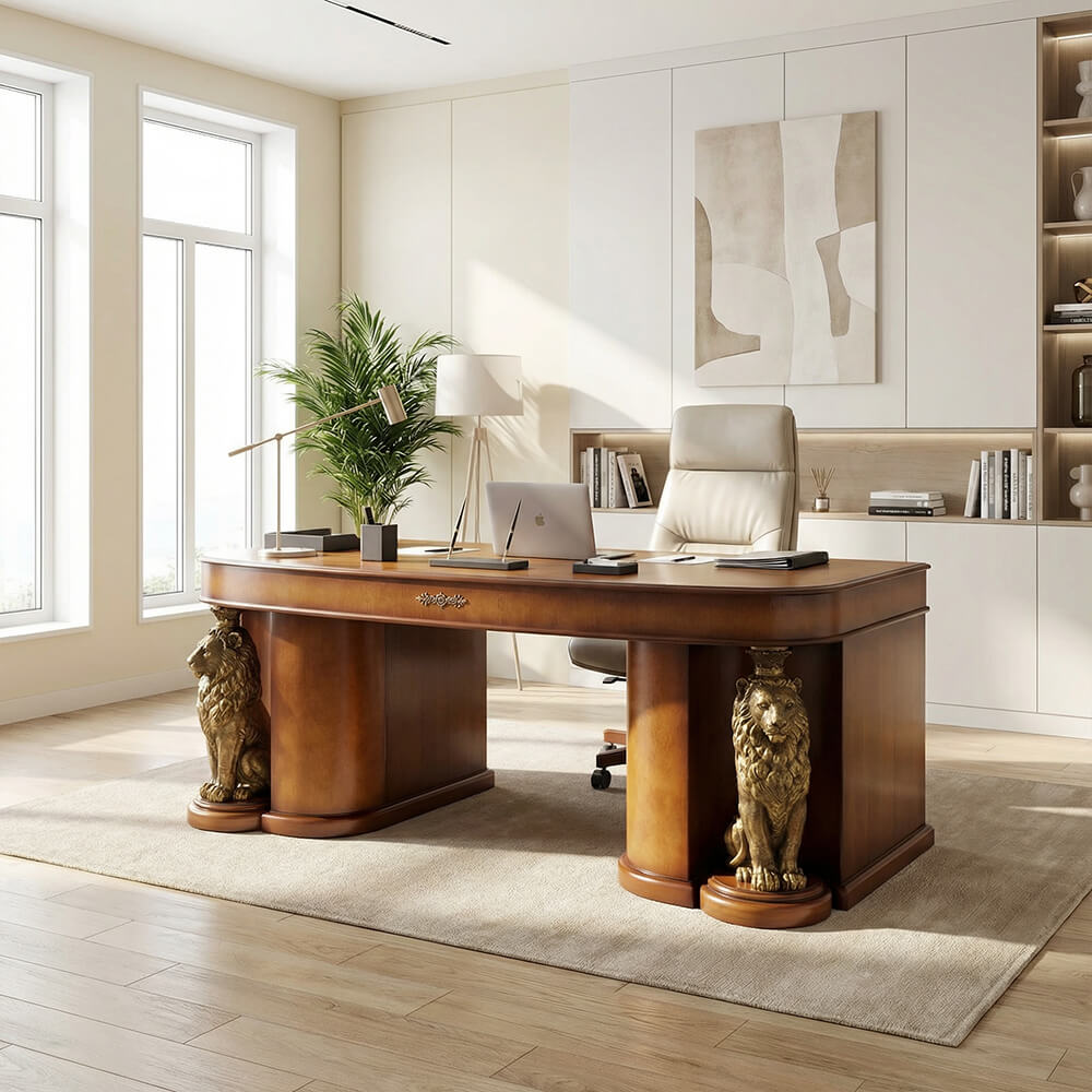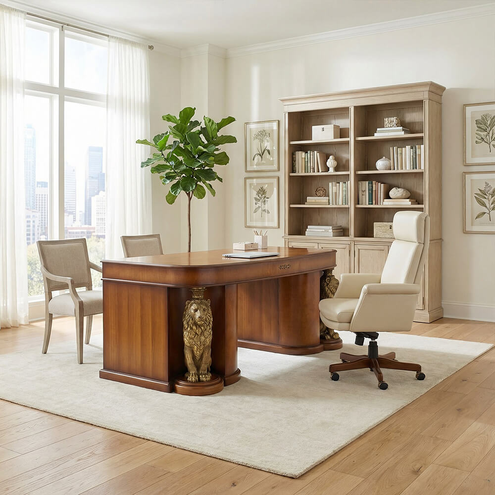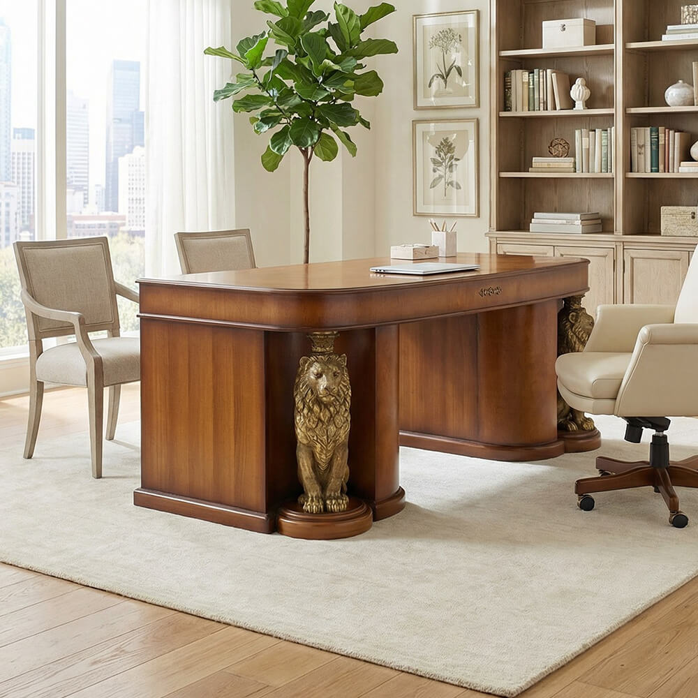 Стол «Лион» будет идеально смотреться в рабочем кабинете. Все Ваши деловые обязанности будут выполняться легко и успешно, ведь за таким столом просто невозможно сделать работу плохо! Вы всегда будете сосредоточены и настроены трудиться. Кроме того, стол прекрасно исполняет функции личной библиотеки и комфортной зоны отдыха.