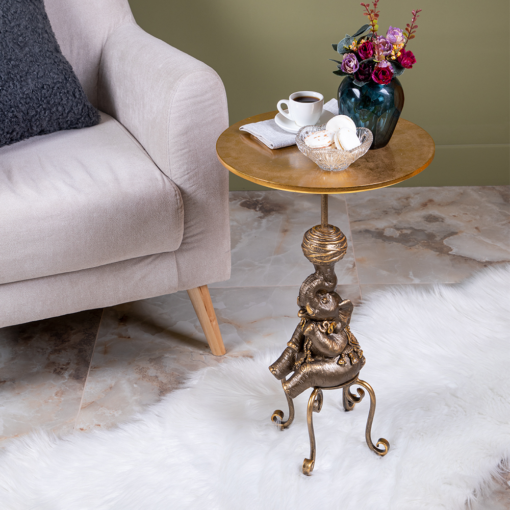 Основание столика выполнено в виде детально проработанной фигуры слона, удерживающего круглую столешницу. Скульптура отлита из натурального коелгинского мрамора и отшлифована вручную. Мастерство исполнения подчеркивает каждую линию, превращая обычный предмет мебели в настоящий арт-объект, приносящий в дом атмосферу благополучия и мудрости.