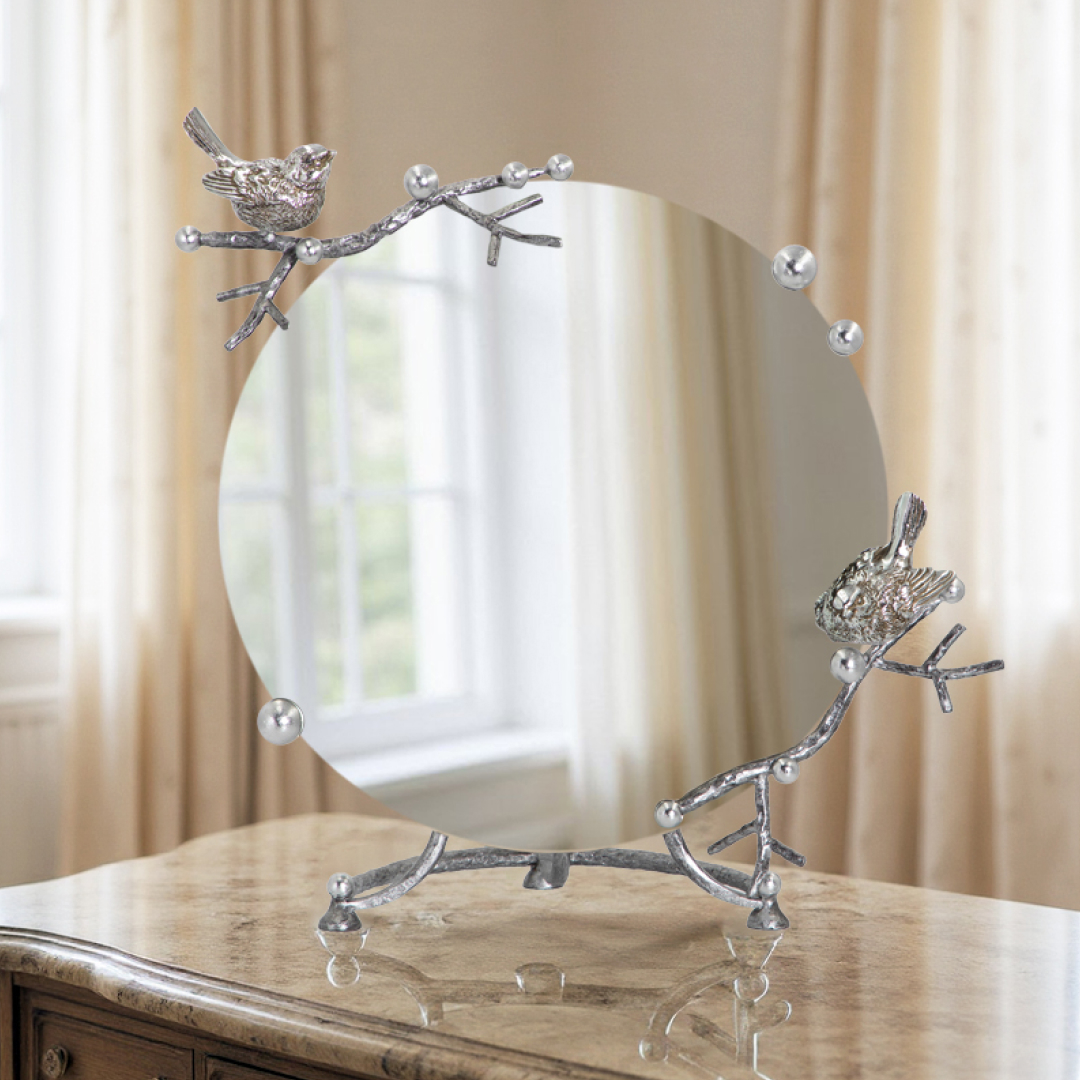 Зеркальное полотно закреплено на металлической раме из легированной стали. Декоративные элементы отлиты из натурального коелгинского мрамора, отшлифованы и патинированы вручную. Диаметр зеркального полотна: 36,8см. Толщина: 4мм.
